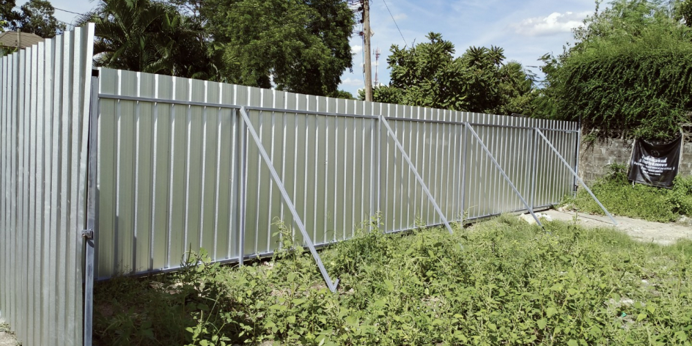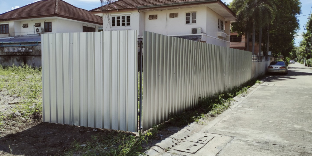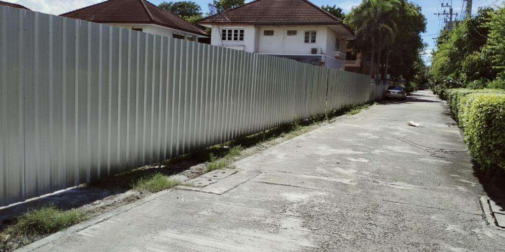 งานสร้างรั้วกั้น ถนน นวมินทร์ งานรั้ว และกำแพง : งานสร้างรั้วด้วยแผ่นเมททัลชีทตลอดแนว ทรัพย์เจริญการช่าง