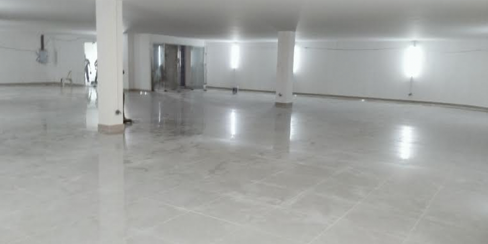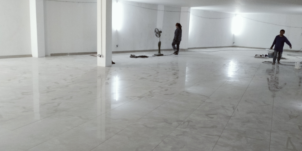 งานกระเบื้อง : งานปูกระเบื้อง ภายในตัวอาคารบริเวณห้องโถง ทรัพย์เจริญการช่าง